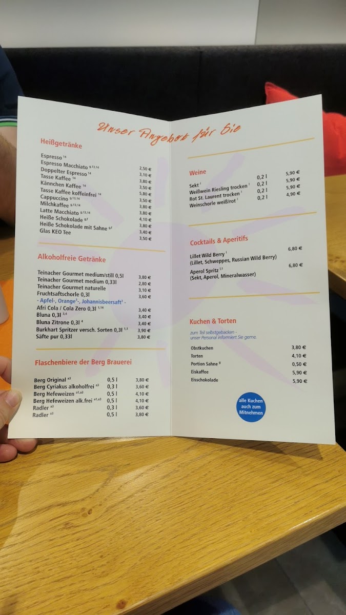 The menu at Museumscafe am Petrusplatz der Lebenshilfe Donau-Iller e.V. offers a variety of options suitable for different times of the day, including breakfast, coffee breaks, and light meals. Visitors can expect a selection of coffee beverages such as brewed coffee and specialty drinks like latte macchiato. Food offerings include breakfast dishes, as well as warm main courses featuring items such as aubergine lasagne and pork strips with rice and mushroom cream sauce. Desserts are also available, including different types of cakes and torte.
